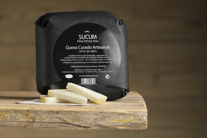 Romero, lavanda, tomillo o jara son algunos de los aromas y matices, entre otros muchos, que encontramos en el queso curado de leche de cabra Sucum. Partiendo de la leche de las cabras de Finca Dehesa Frías, elaboran el queso mediante un proceso eminentemente tradicional en el que sólo se aporta cuajo de cardo y sal. Para el proceso de curación, a temperatura y humedad controlada, untan mediante un paño de algodón el exterior del queso con aceite de oliva virgen extraSucum, hasta formar una corteza que sella el queso permitiendo una maduración homogénea. Se recomienda consumir a temperatura ambiente, sin acompañamiento para no adulterar su sabor intenso, textura untuosa poco habitual en quesos curados de cabra y personalidad. Los amantes del maridaje podrían acompañarlo con vinos tintos y los más golosos con membrillo o mermelada de castaña.