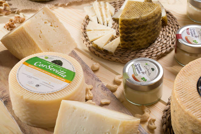 CorSevilla es una cooperativa formada por más de 600 familias ganaderas que elaboran artesanalmente quesos de cabra en la Sierra Morena de Sevilla. La materia prima es la leche recién ordeñada de cabra de raza florida. Ofrecen una amplia variedad de quesos, desde el viejo ‘Gran Reserva’ hasta los más suaves como los rulos de cabra o quesos frescos. Tienen variedades como el curado al pimentón, de leche cruda, con aceite de oliva virgen o al romero. Sus cremas de queso vienen en tres sabores: tradicional, con pasas y con lomo ibérico. Además, ofrecen quesos sin lactosa. Sus quesos cuentan con la Marca Parque Natural de Andalucía y el sello de Calidad Certificada de Andalucía y han sido reconocidos en concursos nacionales e internacionales. Al elegir sus productos, se apuesta por el desarrollo sostenible de las zonas rurales.