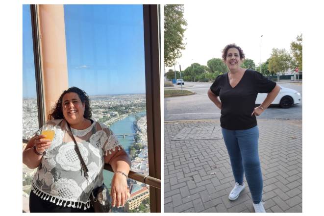 Mercedes Díaz, paciente de Vithas Sevilla, antes y después de su intervención que le ha permitido perder casi 100 kilos
