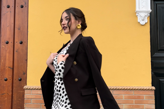 Blazer de Michael Kors, vestido Mango Outlet y pendientes Lola Casademunt para Sevilla Fashion Outlet
