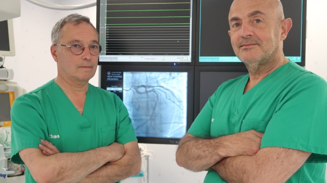 El Dr. Manuel Vizcaíno, especialista en hemodinámica de Vithas Sevilla, junto a José Carlos Dorado, enfermero de hemodinámica.