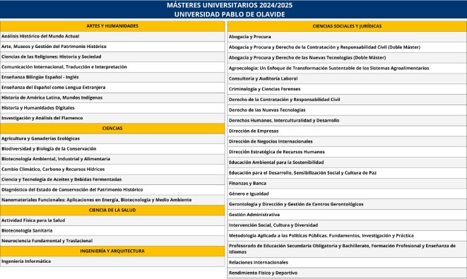 La Universidad Pablo de Olavide impartirá el próximo curso un total de 43 Másteres Universitarios orientados a la especialización académica, investigadora y profesional al tener un enfoque práctico para impulsar la empleabilidad de sus estudiantes. El número de plazas para el curso 2024/2025 será de un total de 1329 para el alumnado de nuevo ingreso, que podrá preinscribirse hasta el 26 de junio en la plataforma online del Distrito Único Andaluz.