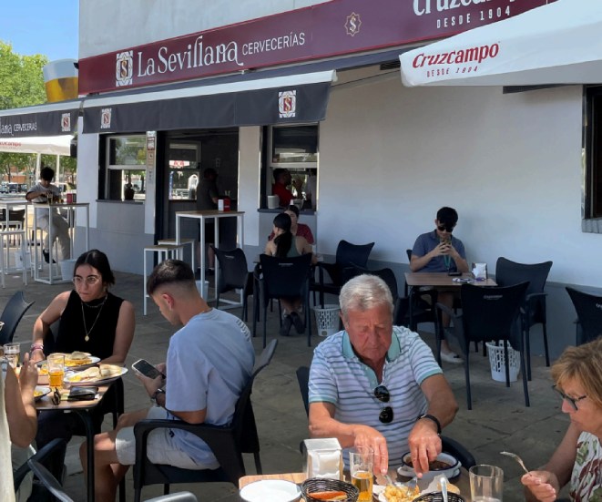 Una de las principales bondades de este bar es su amplia terraza, con vistas al Alamillo, situada en una gran explanada con sombra. «Probablemente sea de las más fresquitas de toda Sevilla», afirman. Entre su clientela hay vecinos pero también multitud de personas que transitan por la zona «y cada vez son más quienes nos buscan por nuestras tapas y nuestra cerveza Cruzcampo», destacan en este bar que presume de ser uno de los que sirve la cerveza más fría de la ciudad. «Está helada, espectacular. A los clientes les gusta el vaso en el que la ofrecemos, un detalle que está gustando a nuestro clientes, es el mismo que trabajan otras cervecerías de éxito».