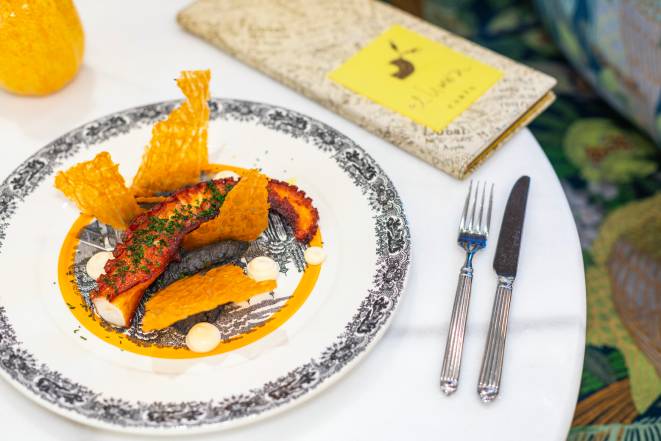 Por último, desde el Restaurante Limón invitan a otra de sus sugerencias, «un original y sabroso pulpo con puré de su propia tinta, acompañado de crujiente de pimentón (hecho con arroz)».