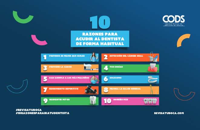 El CODS trabaja por transmitir la importancia de mantener una adecuada salud bucodental a los ciudadanos, para ello se requiere unos cuidados de higiene diarios por parte del paciente y visitas regulares al dentista. Ésta es la base.