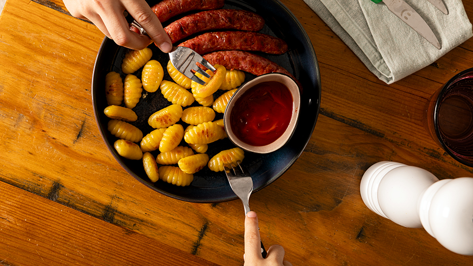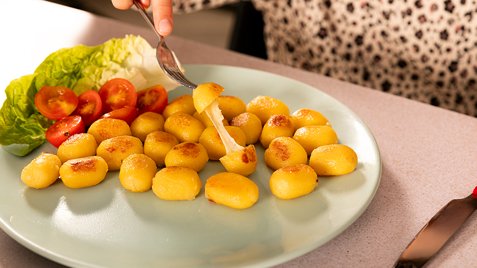 Su preparación es tan sencilla como rápida: basta con calentar media cucharada de aceite en una sartén a fuego medio, añadir los ñoquis directamente del envase y cocinarlos durante unos minutos, removiendo o salteando suavemente hasta que adquieran un dorado «apetitoso». No hacen falta ollas, ni esperar a que hierva el agua, ni escurrir. Sin pasos intermedios: simplemente abrir el paquete, saltear y disfrutar.