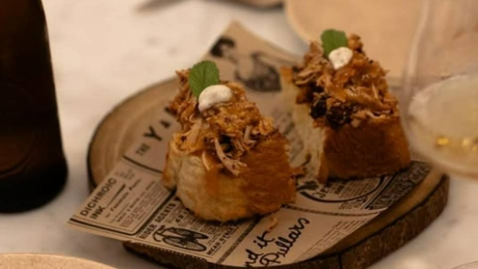 — Perrito Mamaina: pan brioche, salchicha ahumada, salsa bravaina, espuma de alioli y chicharrones crujientes.