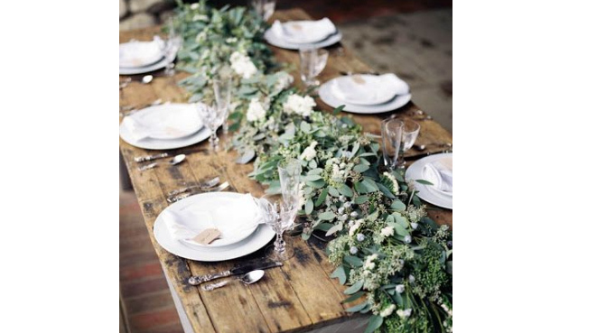 La clásica decoración de las mesas también ha cambiado mucho: se sustituye el clásico centro que estorba en las conversaciones entre los invitados por caminos de vegetación. Verdes y flores trabajados sobre la mesa in situ por el florista, muy orgánico, combinado con cristal, velas, cítricos etc. Los limones y el musgo son muy demandados en verano. Naranjas, granadas, calabazas en otoño, hojas de roble, abeto, algodón y castañas en invierno, etc. La combinación de flores y frutas siempre será una idea brillante en la decoración de una boda.