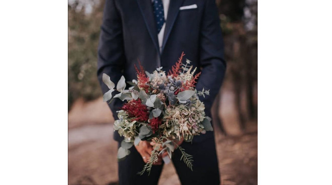 Si, cada vez más son los chicos que quieren llevar un ramillete entre las manos, a mí me encantan los bouquets pequeños de verdes aromáticos; también un clásico para hombre es el botonier o prendido floral para la solapa. Cada vez son más sofisticados y hay chicos que eligen su propio diseño. Los he montado con plumas, olivo con sus aceitunitas, romero… Un mundo de posibilidades, según cada hombre.