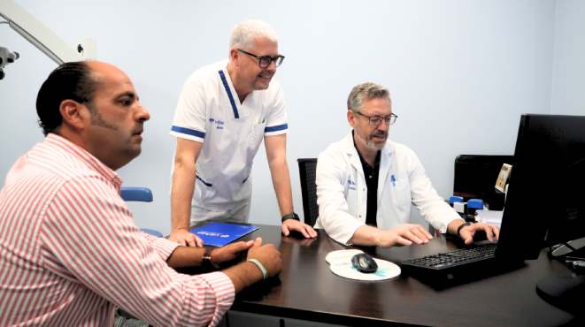 Los dres. Ismael Rando y Jesús Miguélez durante una revisión a Salvador Martín en el Hospital Vithas Sevilla.
