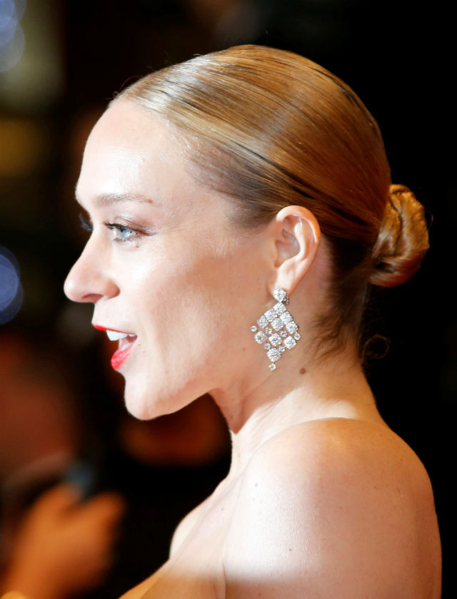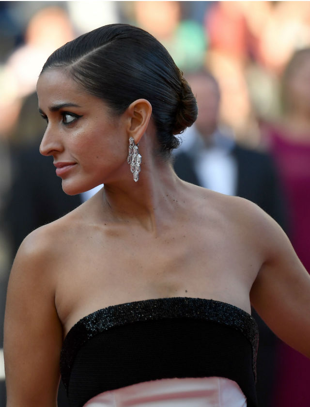 Inma Cuesta decidió despejar el rostro con un recogido bajo y efecto wet con raya a una lado.
