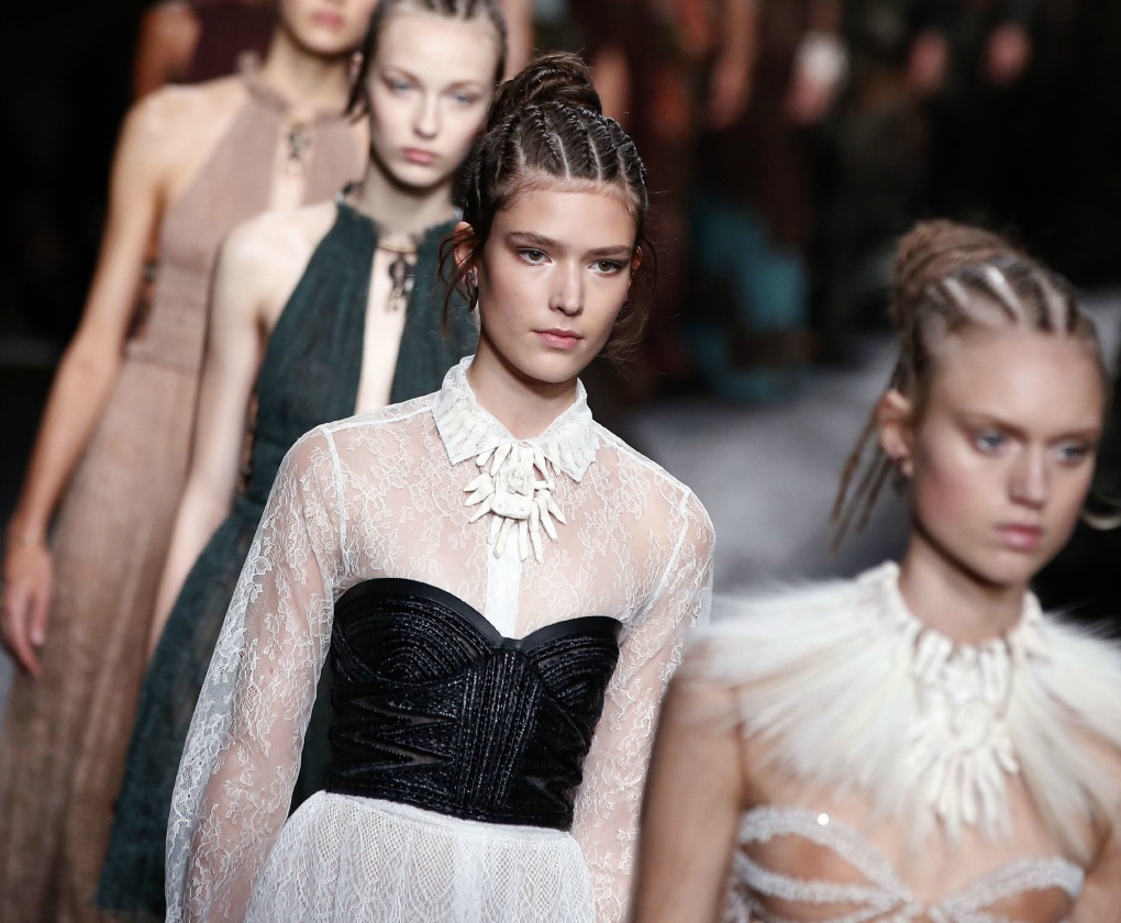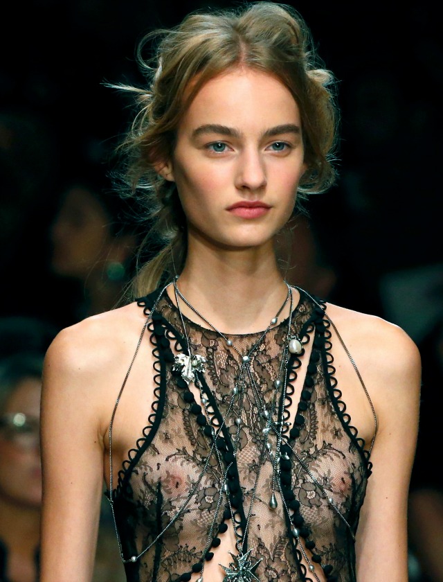 El desfile de Alexander McQueen modelos con recogidos de trenzas messy y maquillaje natural que destaca las cejas. Reuters