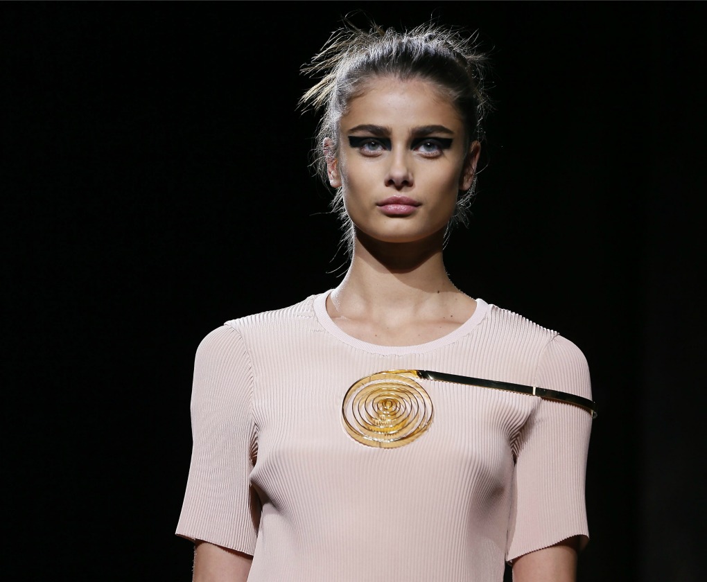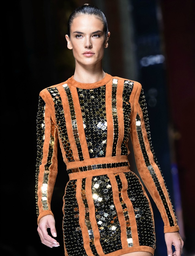 La top Alessandra Ambrosio para Balmain. Cabello recogido y maquillaje muy suave pero que marca las facciones de la modelo. AFP
