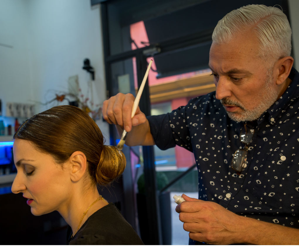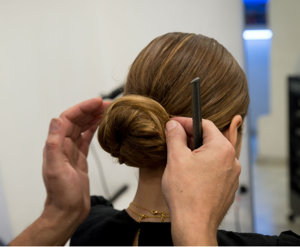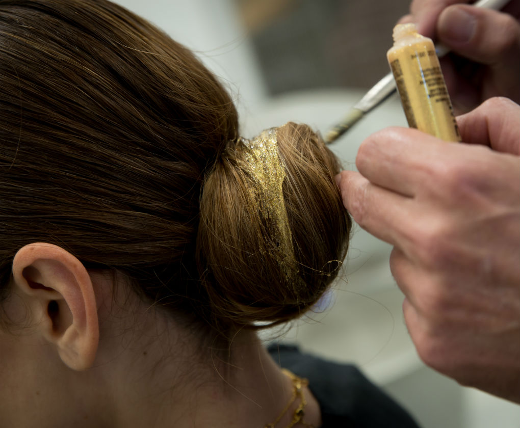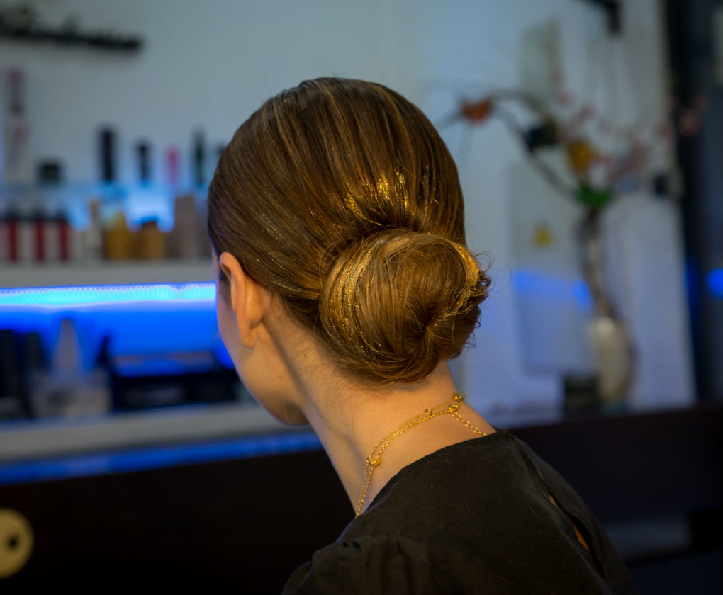 Peinado para Navidad, un recogido bajo con toques de dorado y plateado.