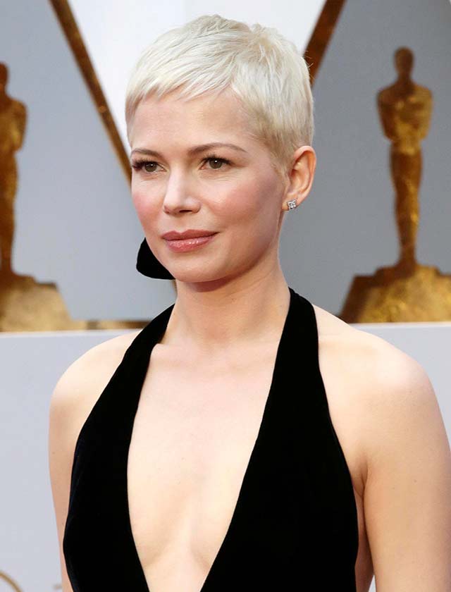 Michelle Williams, con su look de pelo corto platino y un maquillaje natural (AFP)
