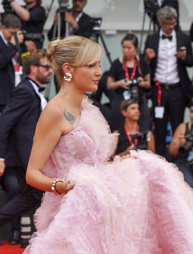 Moño de estilo bailarina a altura media y mechones sueltos de Sienna Miller.