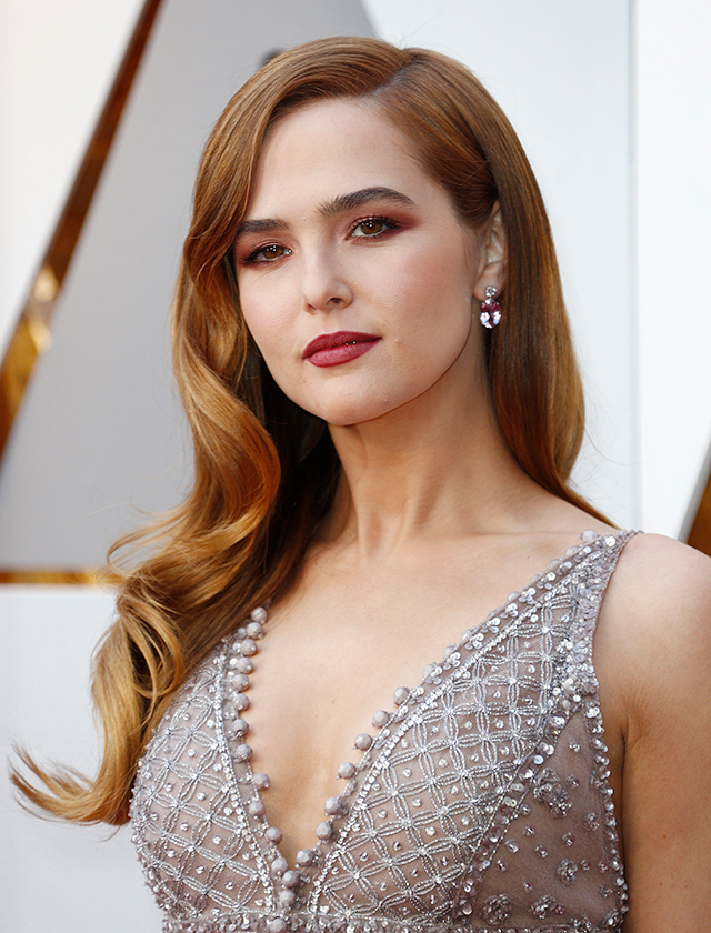Zoey Deutch apostó por unas ondas Hollywood para lucir su bonita melena pelirroja y por un maquillaje «total look» en tonos burdeos. (EFE)