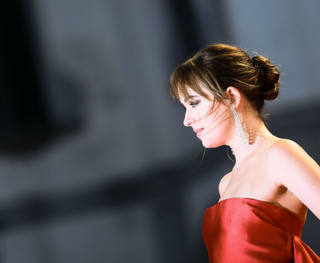 Dakota Johnson con su habitual flequillo y recogido bajo.