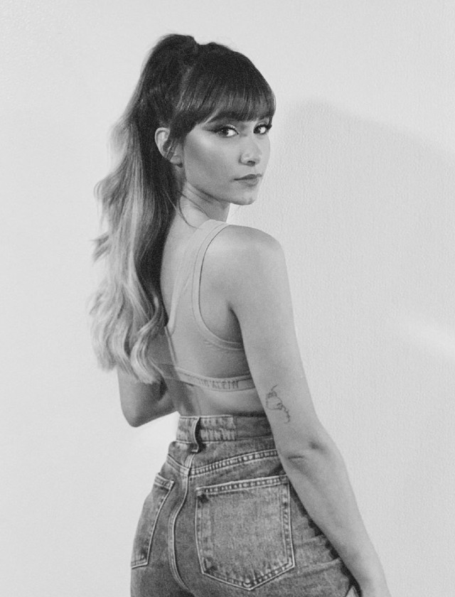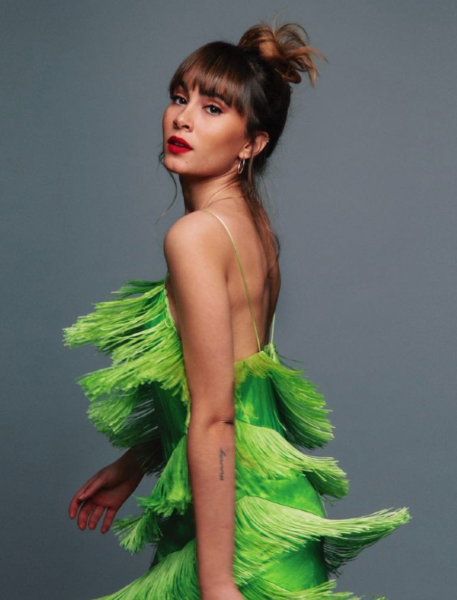 Melena trabajada con ondas elegantes y flequillo de Aitana.