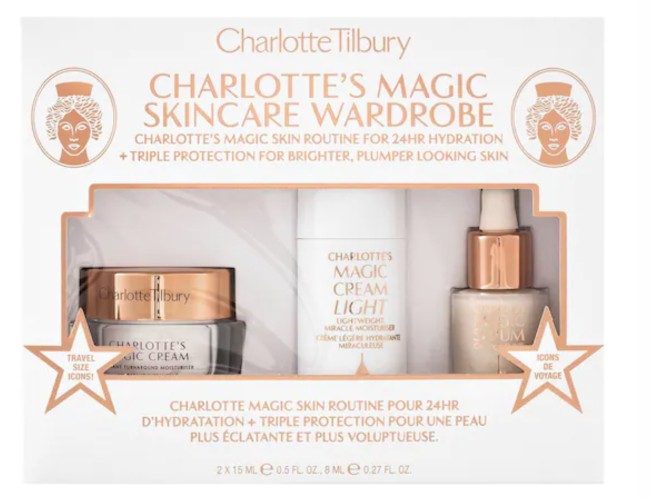 Charlotte´s Magic Skincare Wardrobe es una rutina mágica para la piel que brinda hidratación las 24 horas y protección triple, para una piel que se ve más resplandeciente y tersa. Los iconos de Charlotte TIllbury en tamaño de viaje. Este set incluye el sérum Magic Serum Crystal Elixir y las crema hidratantes Magic Cream y Magic Cream Light. Su precio es 71,99 euros.