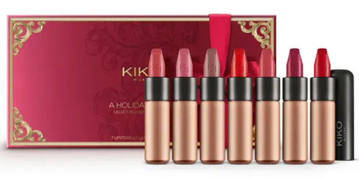 A Holiday Fable Velvet Passion Lipstick Set es un kit de labios de Kiko Milano compuesto por 7 labiales mate en 7 tonos diferentes dentro de un precioso paquete para regalo. El kit contiene tiene tonos de su N.7 Velvet Passion Matte Lipstick (311 – 312 -315 -316 -317 – 328 -329) con una textura cremosa y envolvente que proporciona a los labios una suavidad extrema y una sensación de confort. La aplicación resulta extremadamente fluida y la pigmentación es inmediata, la cobertura es de media a alta.