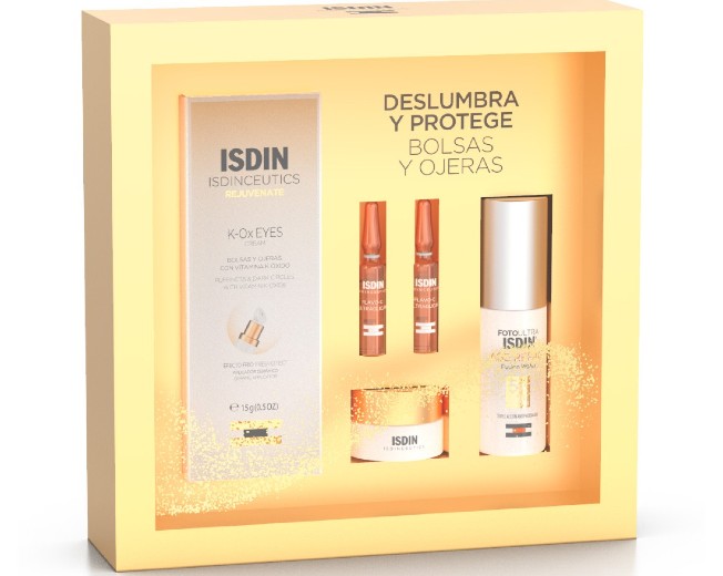 El pack Deslumbra y Protege de Isdin contiene su éxito de ventas K-Ox Eyes 15ml, un contorno de ojos para combatir bolsas y ojeras y la edición limitada con 25ml de Age Repair, el fotoprotector solar con SPF50 y triple acción anti-envejecimiento. Además, cuenta con dos formatos pequeños de regalo: 2 ampollas Flavo-C Ultraglican con Vitamina C y A.G.E. Reverse Day 7ml una crema antiedad con acción antipolución, remodelante y antiglicación. Su precio es de 49,90 euros.