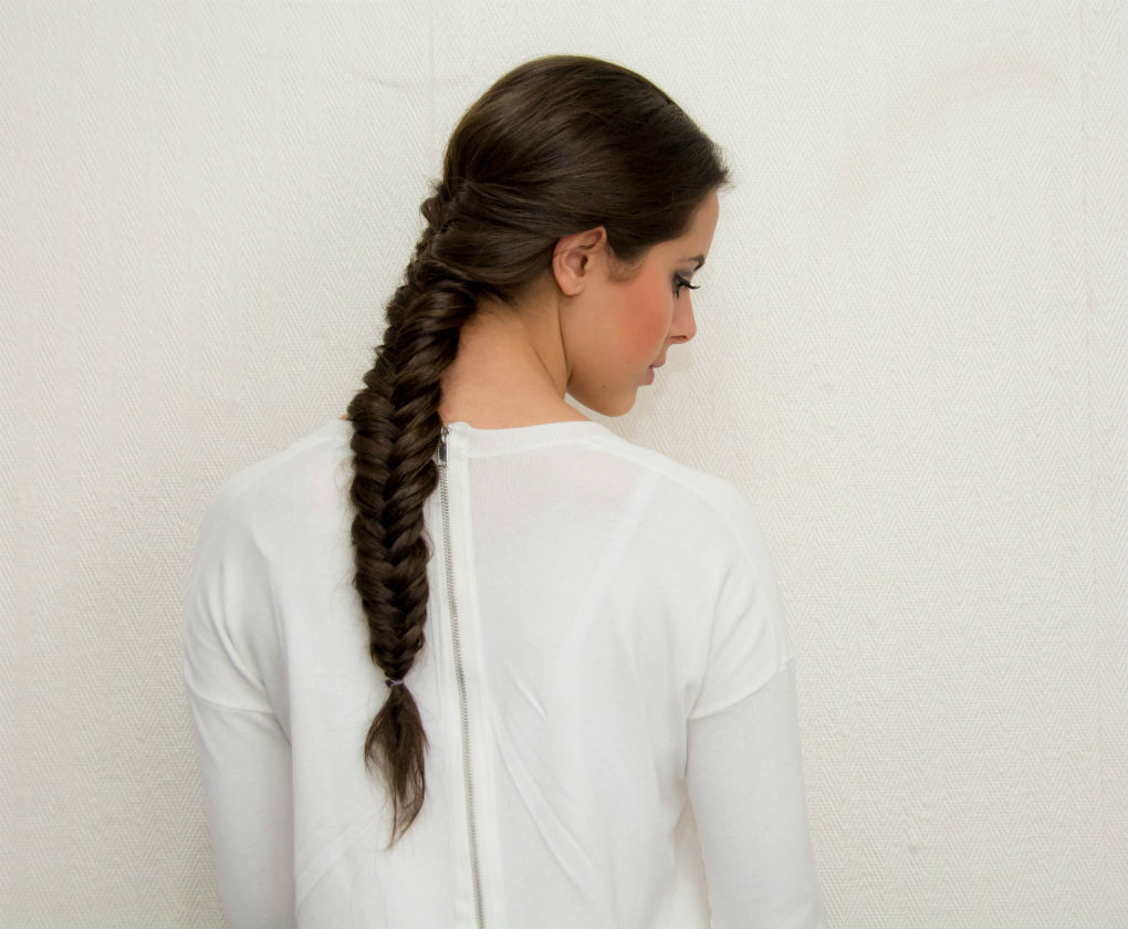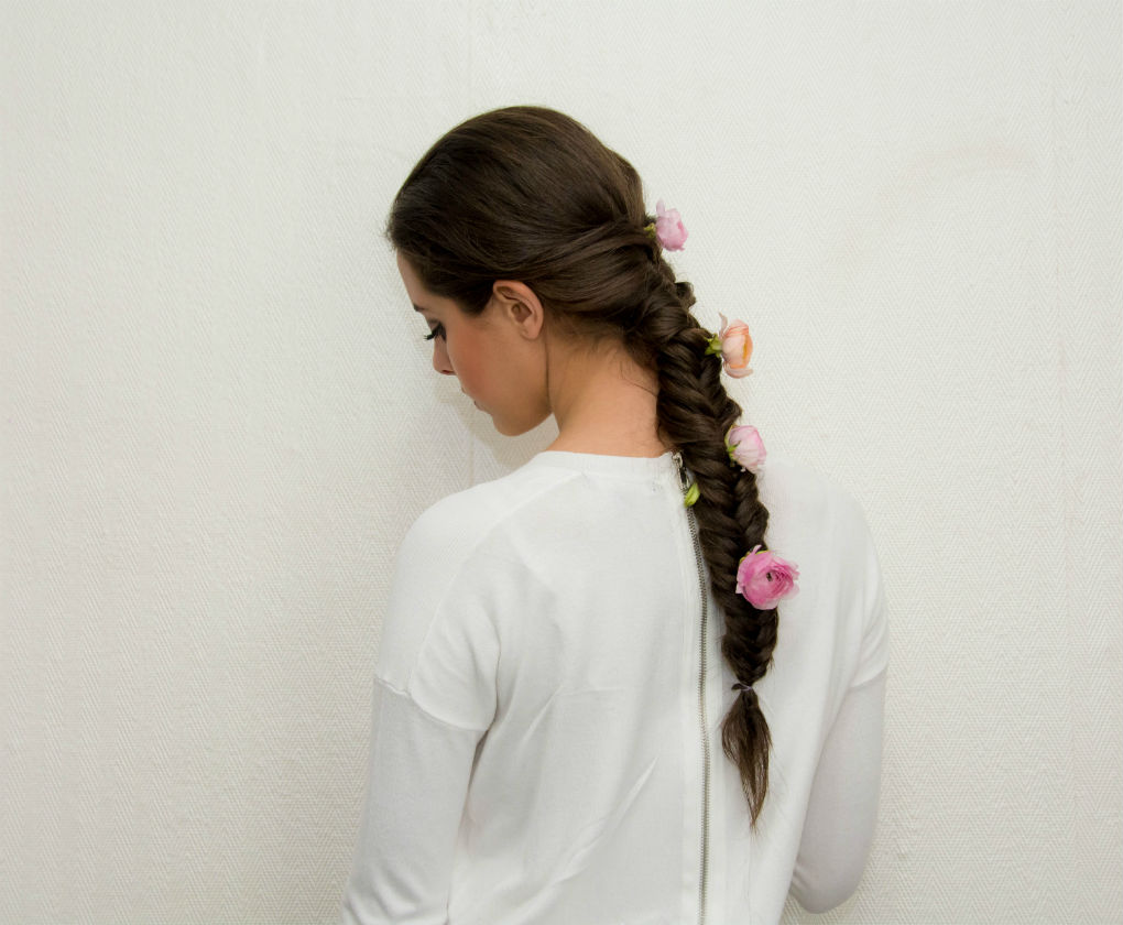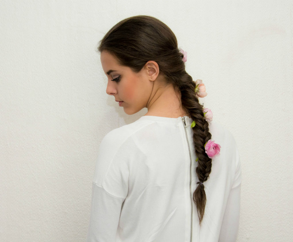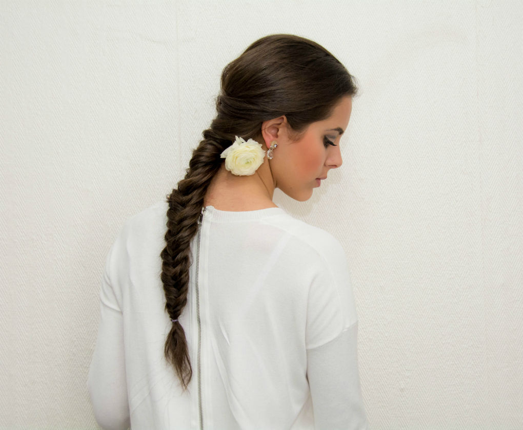 Peinado para novias románticas, trenza de espiga con flores naturales.