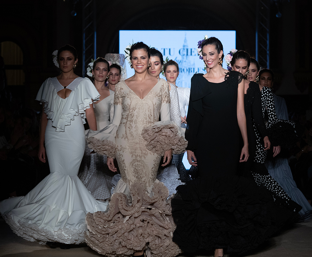 Las flamencas de Daniel Robles desfilaron con un priginal recogido bajo elaborado con una trenza de raíz (Aníbal González)