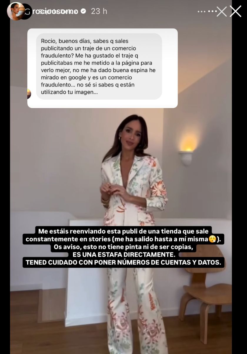 “Me estáis reenviando esta publi de una tienda que sale constantemente en stories (me ha salido hasta a mi misma). Os aviso, esto no tiene pinta ni de ser copias, ES UNA ESTAFA DIRECTAMENTE. TENED CUIDADO CON PONER NUMEROS DE CUENTAS Y DATOS”, comentaba Rocío Osorno en sus historias avisando de la estafa.