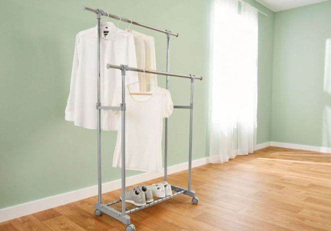 Se trata de un perchero que bien podría sustituir a los armarios para siempre. Consiste en 4 extremos extensibles, hasta unos 10 cm cada uno, con 4 ruedas giratorias y 2 de ellas con freno.