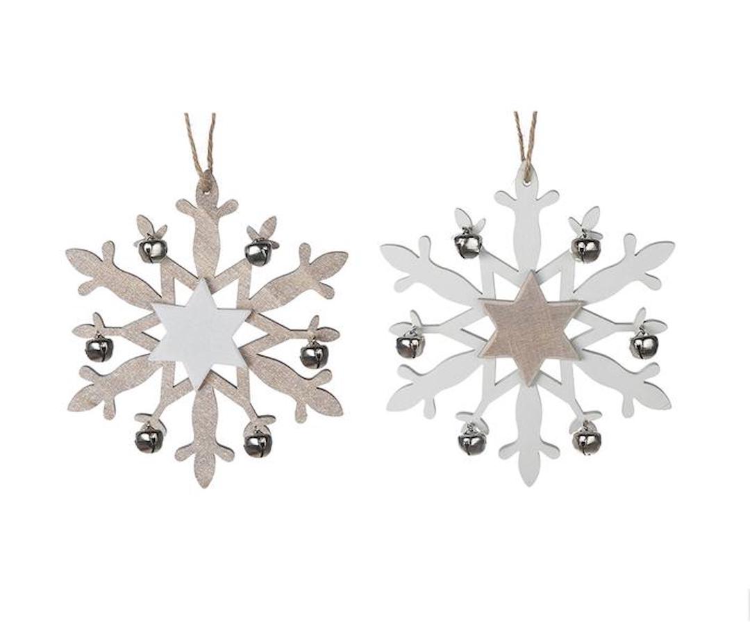 Motivos navideños como los copos de nieve se convierten en adornos elegantes y muy vistosos aunque se trate de diseños de madera como estos, que incluyen unos simpáticos cascabeles que ayudarán a ambientar la casa.