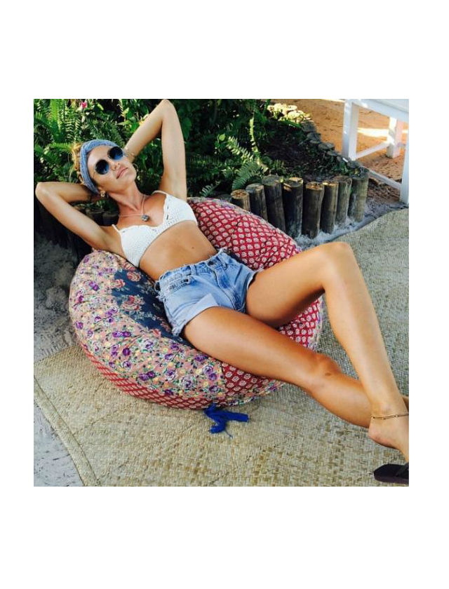 Candice Swanepoel con bikini de crochet blanco combinado con shorts vaqueros. Instagram.