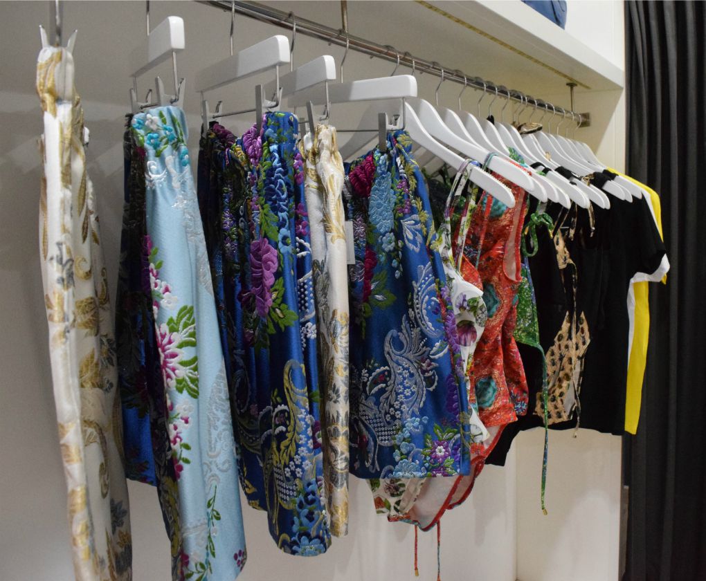 Muestra de la pequeña colección de faldas de tela valenciana de Carmen Berdonces y la ropa de baño de Nadadora