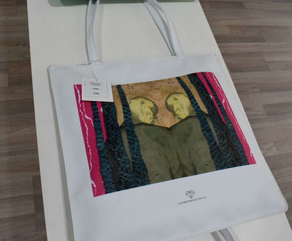Uno de los bolsos-arte con la obra de Paco Berdonces pasada por el filtro del estilo de Carmen