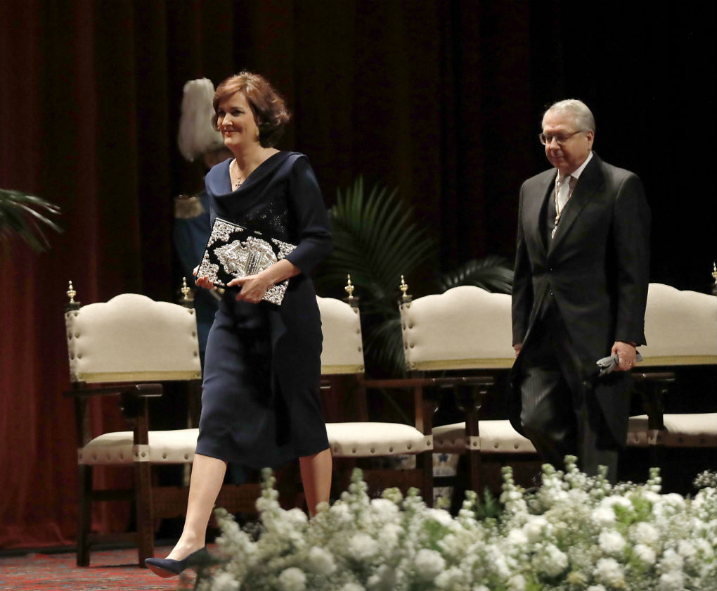 «La apuesta fue combinar dos telas dentro de la sobriedad porque ella es una mujer joven y no queríamos vestirla de mayor», explica Rocío Montero. Han combinado una fibra natural (triacetato) que se adapta muy bien al cuerpo con una aplicación de encaje rebrodé con un poco de brillo en negro. «Era un vestido que iba a estar muy expuesto, se pensaron todos los detalles. Desde el escote despejado con cuello al bies que acaba formando en la espalda dos hombreras hasta la espalda que va también muy trabajada», explica la diseñadora.