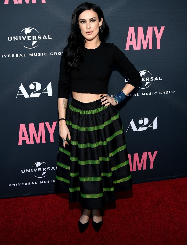 Rumer Willis muestra otra posibilidad, cropped top de manga francesa con falda con vuelo de largo midi. AFP
