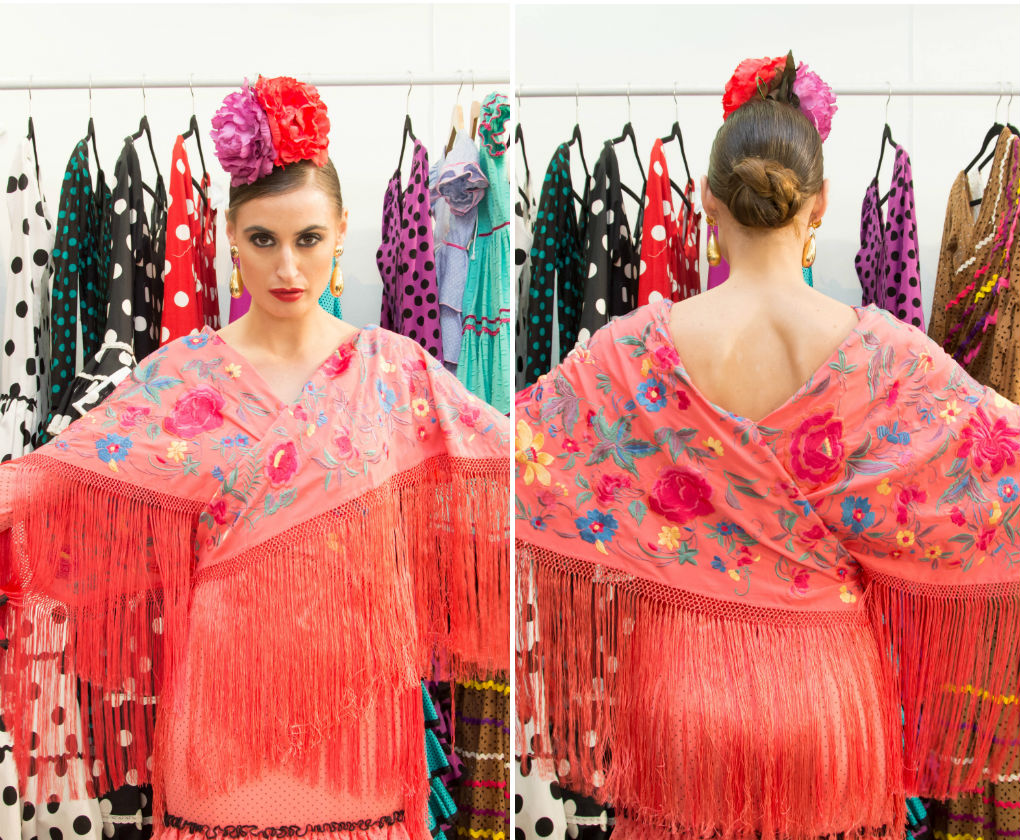 Hace años estuvimos en el taller de Rocío Peralta y nos mostró esta forma de llevar un mantoncillo. Se consigue un efecto cruzado o tipo kimono con dos mantoncillos sobre el traje de flamenca.