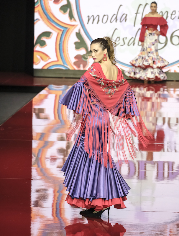 Para el desfile de 2019 en We Love Flamenco, Rocío Peralta apostó por colocar el mantoncillo de lado a lado del traje de flamenca. De este modo uno de los hombros queda cubierto por el mantoncillo y los flecos cruzan el pecho y la espalda hasta unirse en el otro hombro.