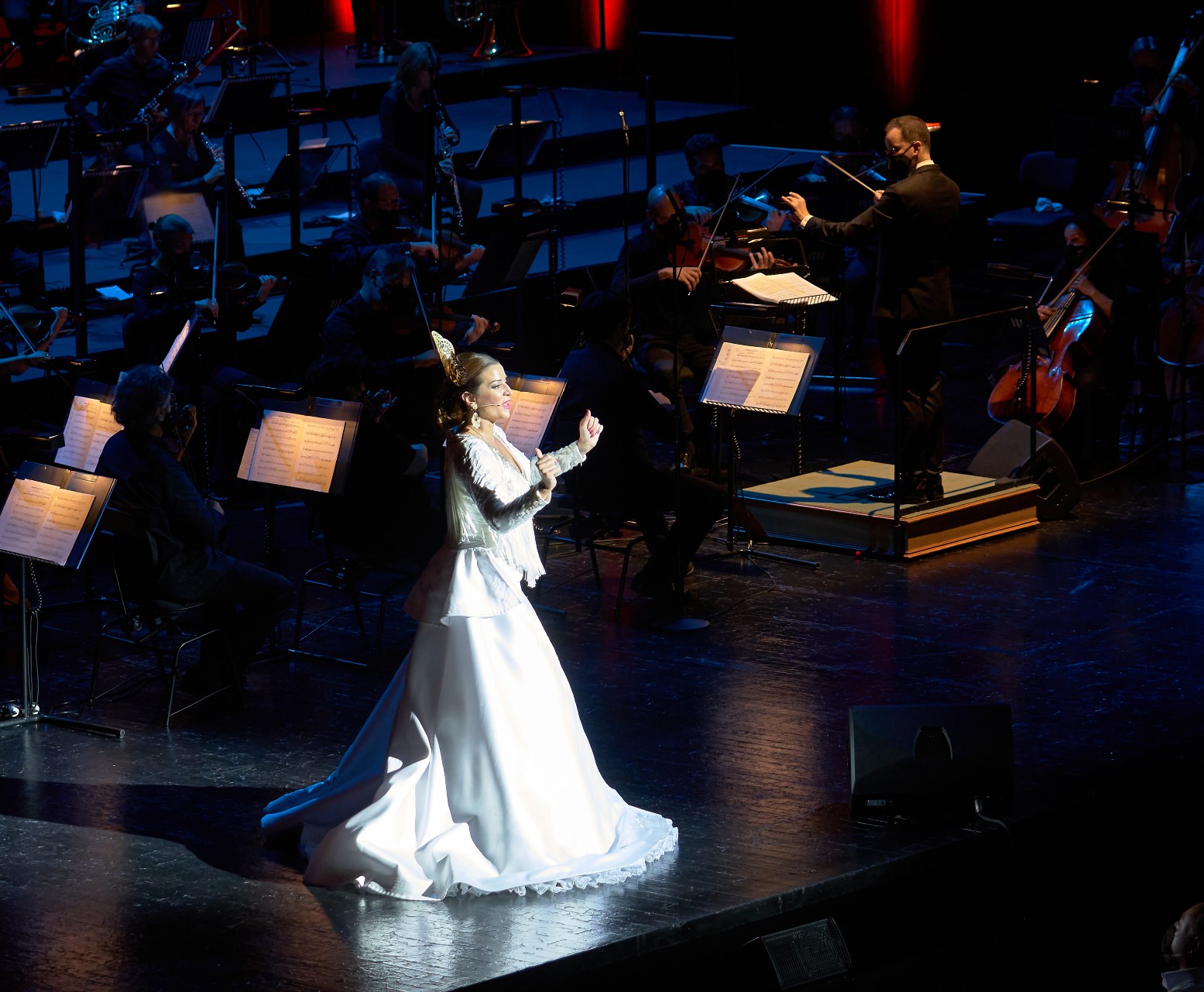Erika Leiva con bata de cola de Francisco Alegre y David Espejo en su concierto en el Teatro Maestranza con la ROSS