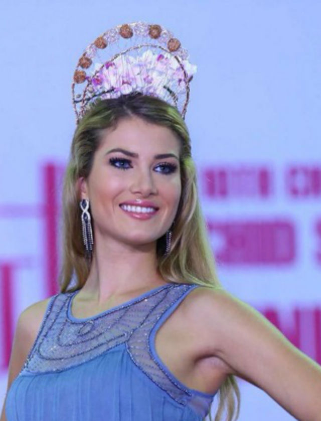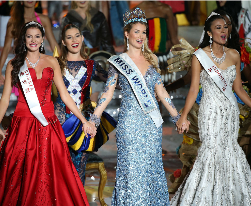 Mireia Lalaguna Miss World Spain saluda convertida en Miss World 2015 con diseño de Tina Olari. Reuters
