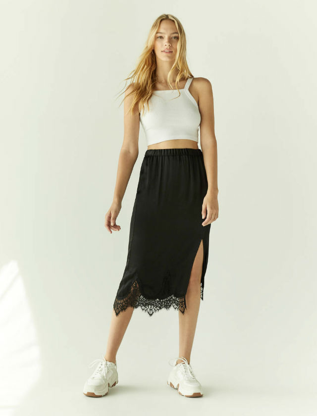 La falda satinada de Bershka con detalle de encaje y abertura, la combinan con deportivas