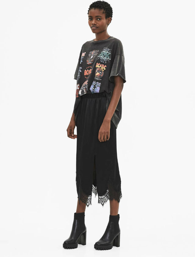La falda satinada de Bershka con detalle de encaje y abertura, la combinan con botas militares