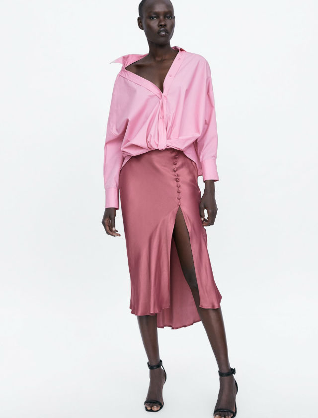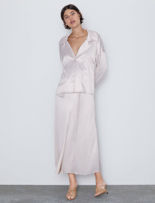 Falda satinada de Zara con sandalias de tacón