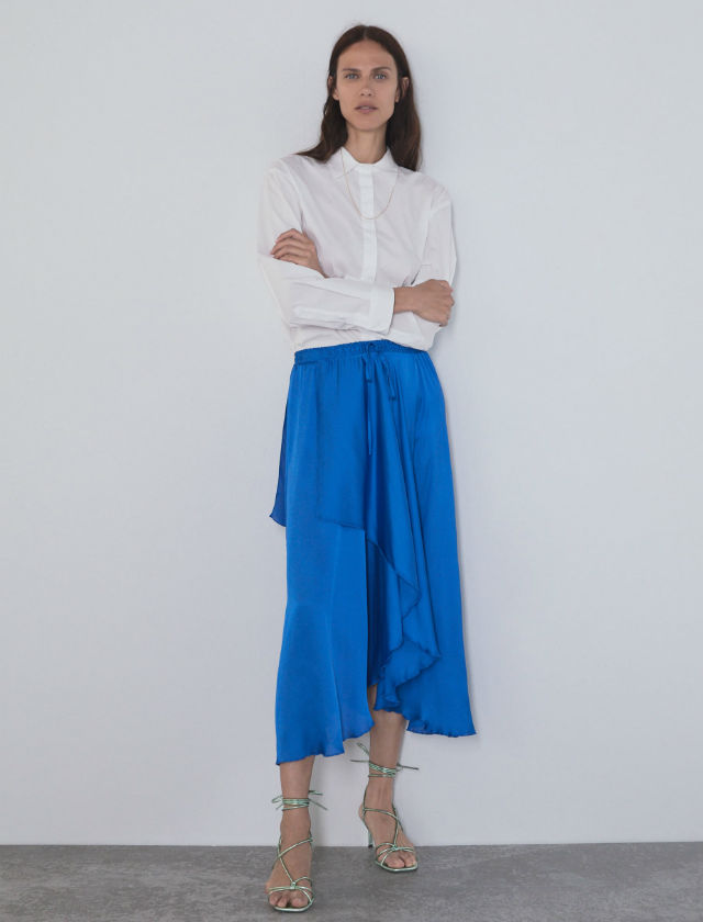 Falda satinada de Massimo Dutti combinada con palas planas