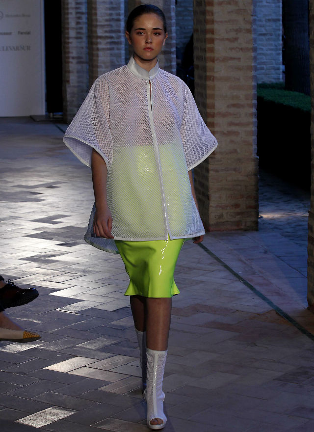 ¿Quién dijo que aquí que del sur no podía salir modernidad? Esta revisión del pasado nos supo a poco y por eso llegó Yvan Andreu hablándonos de cómo ve el futuro. Su colección «0,23» viste con tejido de rejilla (que también ha utilizado para botines), plástico, vinilo, neopreno y prendas con estampaciones en 3D. El futuro con aires setenteros en diseños de tendencia muy apetecibles y juveniles.