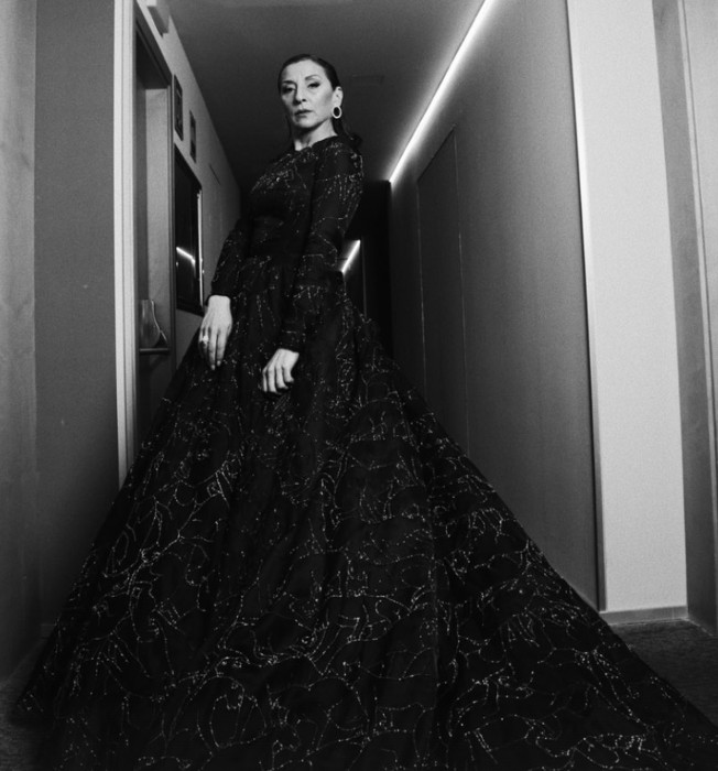 Luisa Mayol, la actriz y mujer de Luis Tosar, lució un vestido con silueta entallada de manga larga y cuello cisne, realizado en terciopelo color negro combinado con cortes de malla de cristal de Swarovski con destello aurora boreal de Andrew Pocrid.