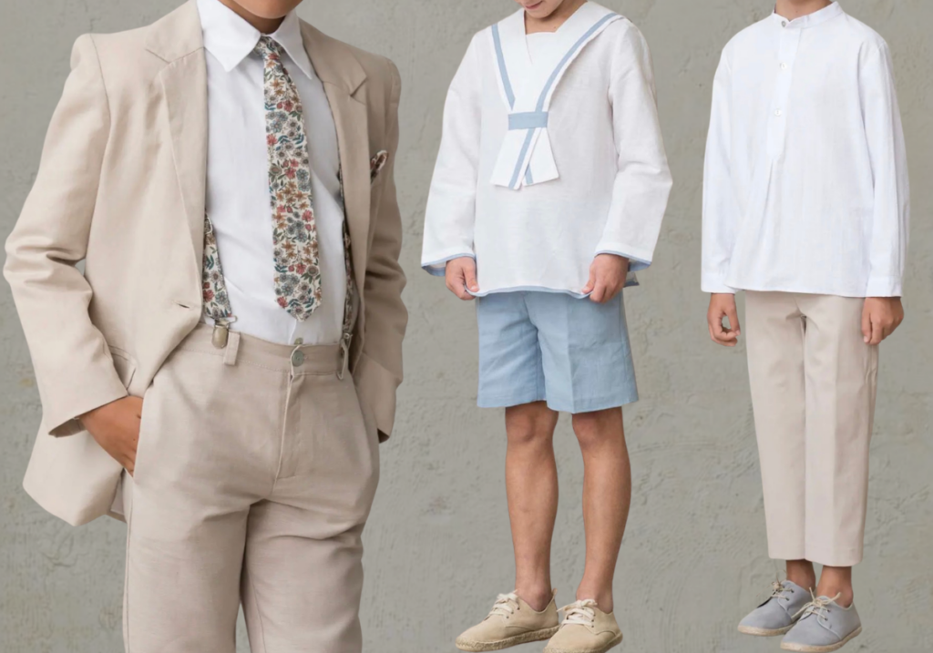 A la hora de elegir el traje, recomiendan tener en cuenta la comodidad del niño. Los tejidos naturales como el lino o el algodón resultan especialmente adecuados para celebraciones que se celebran en primavera, ya que permiten mayor transpiración. En cuanto a los colores, aunque el blanco continúa siendo uno de los tonos más tradicionales por su simbolismo de pureza, en las colecciones actuales también se imponen otras tonalidades elegantes como el beige, el marfil, el azul marino o el gris claro. En los últimos años se observa además una tendencia hacia paletas más suaves y naturales, con colores como arena, celeste o tonos tostados, que aportan luminosidad y encajan especialmente bien con celebraciones primaverales.