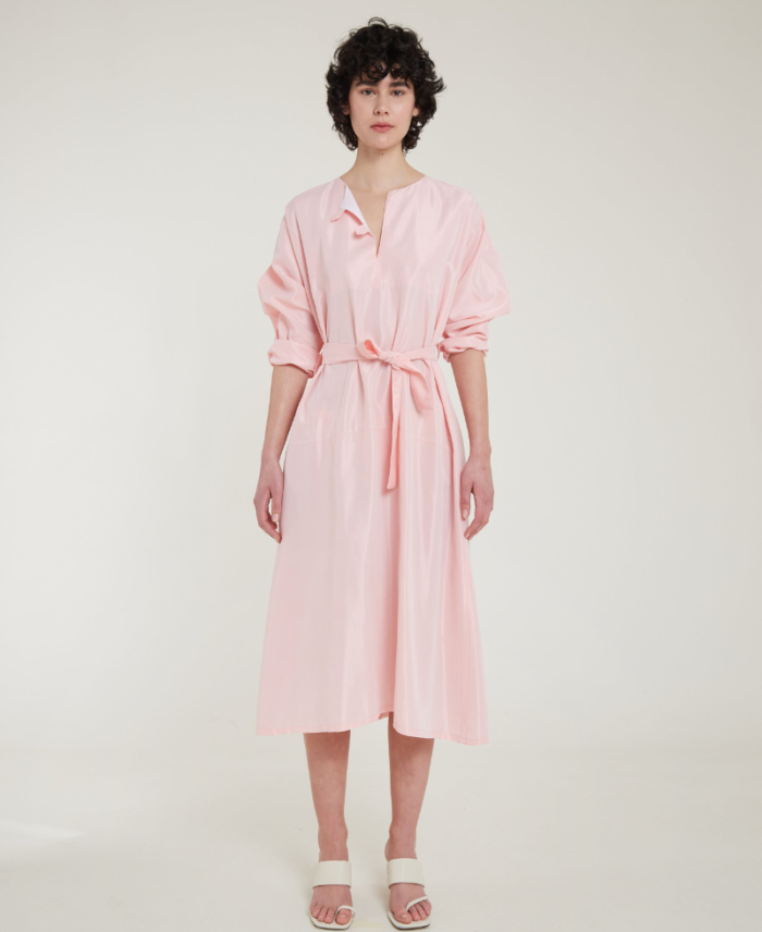 Una de las curiosidades es que es un vestido de talla única (sirve para varias tallas), de corte holgado y que se ajusta a la cintura con un cinturón del mismo tejido y color. Cuenta con bolsillos invisibles y con un elegante fruncido en espalda. Y el rosa, sin duda, es uno de los colores más en tendencia en 2023. Siendo uno de los preferidos en moda, belleza y decoración en cualquiera de los tonos de la amplia gama cromática que va del rosa fucsia a este rosa más suave y empolvado.