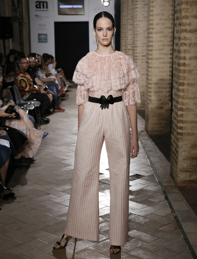 Alejandro Postigo viajó en el tiempo, hasta «1976», año en el que nació para revisitar las tendencias que vestía su madre. Gasa natural, brocados, sedas perforadas y mikados que visten diseños de amplios vuelos, mangas vaporosas, pantalones de campana, plisados, abrigos lady y cuellos redondos con lazadas. ¿Colores? Para el de Utrera solo existen el rosa y el rojo en un trabajo coherente y sofisticado que ha cerrado con una espectacular salida con la colaboración de Tolentino en el tocado.