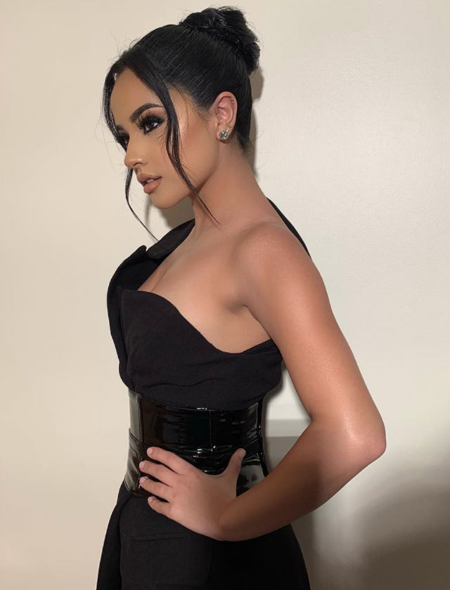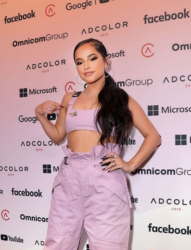 Becky G con un impresionante vestido de fiesta con escote en la espalda.